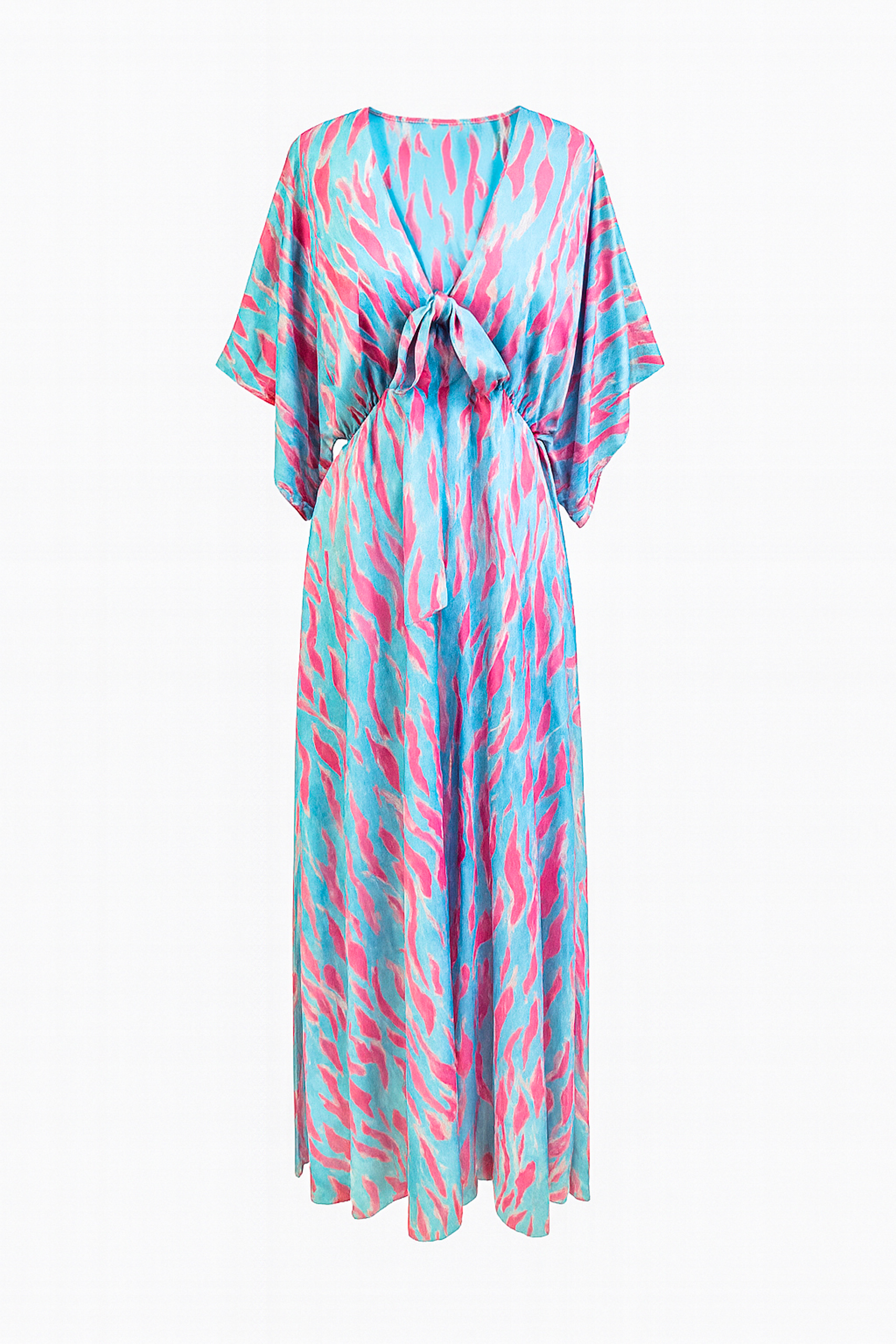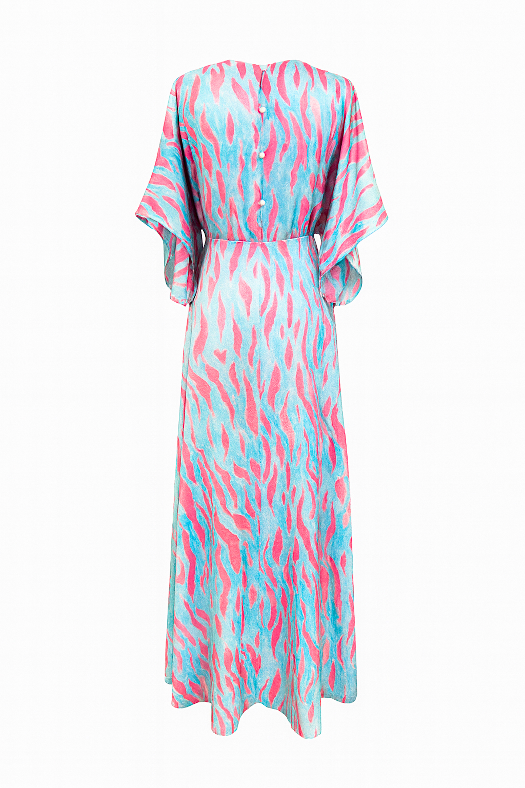 Fluido maxi vestido confeccionado en tela satinada ligera que cae con movimiento y brillo suave. presenta un estampado abstracto con tonos vivos , que se combinan en formas onduladas y orgánicas, evocando energía, frescura y un toque tropical. Escote en «V», que finaliza con un lazo de la misma tela y mangas amplias tipo kimono, que aportan comodidad y caída elegante. Por la parte trasera, cierra con abotonaduras en la espalda y una cremallera invisible a nivel de la cadera. Es ideal para eventos de día en climas cálidos, como una boda en la playa o un coctel al aire libre. Te sentirás libre, fresca, vibrante, conectada con un aire bohemio-chic y sofisticada sin esfuerzo.
