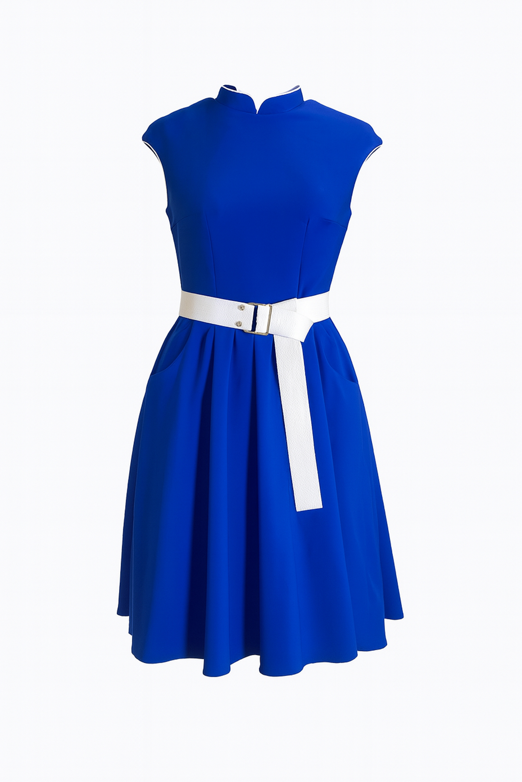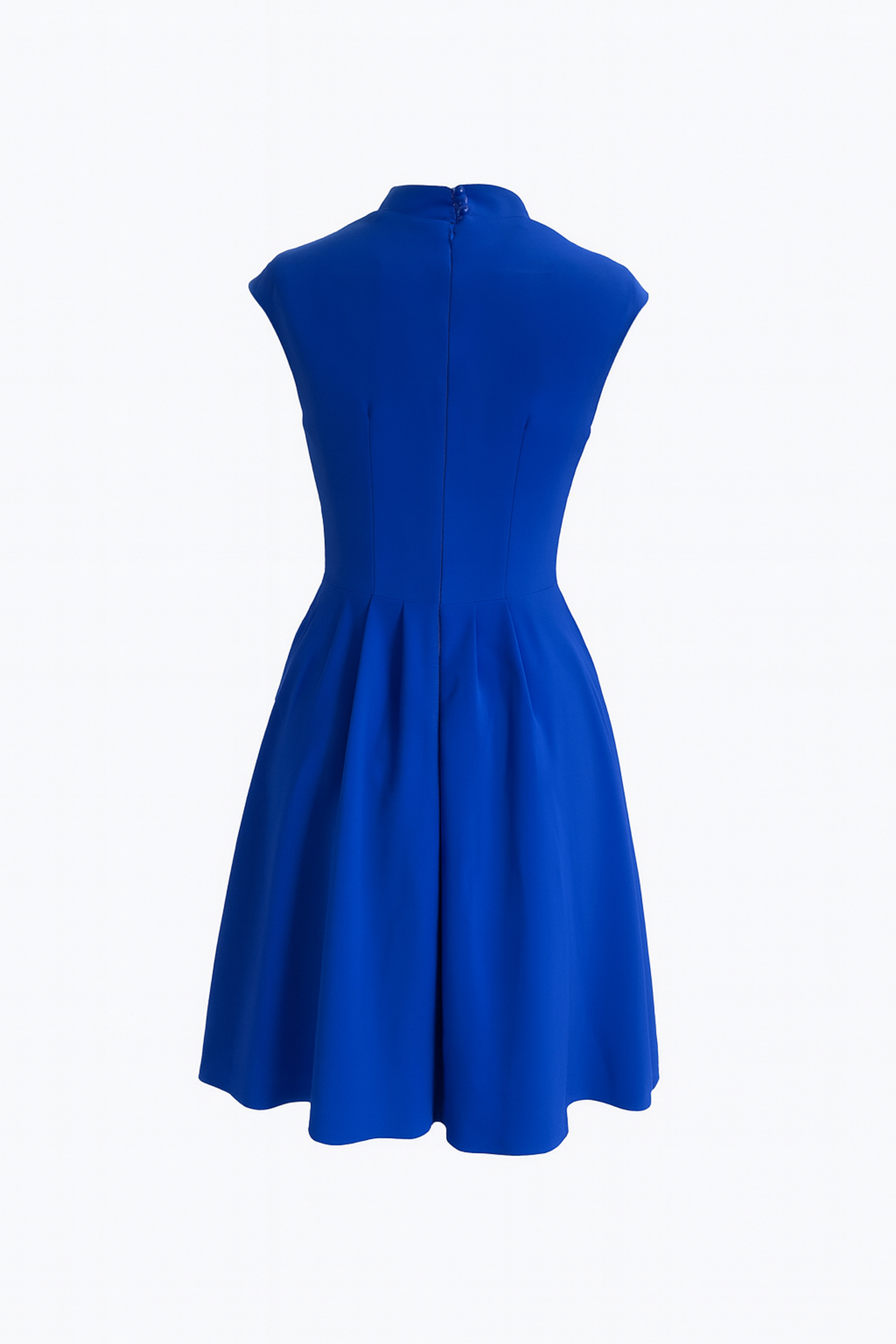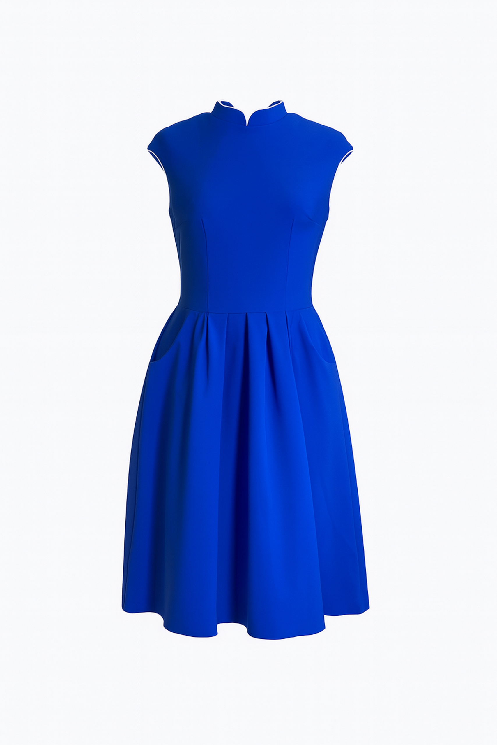 Un diseño que equilibra fuerza y sutileza. Redefine la elegancia contemporánea con una silueta fit & flare que realza la figura femenina sin esfuerzo. Su tejido estructurado de caída fluida esculpe el cuerpo con naturalidad, mientras el cuello mao y las mangas cap aportan carácter y refinamiento. Cada pliegue de la falda genera movimiento y vida, acompañando tu paso con equilibrio y magnetismo. Posee bolsillos y un fondo que aporta volumen a la falda. Cremallera en la parte posterior. Cinturón no incluido.