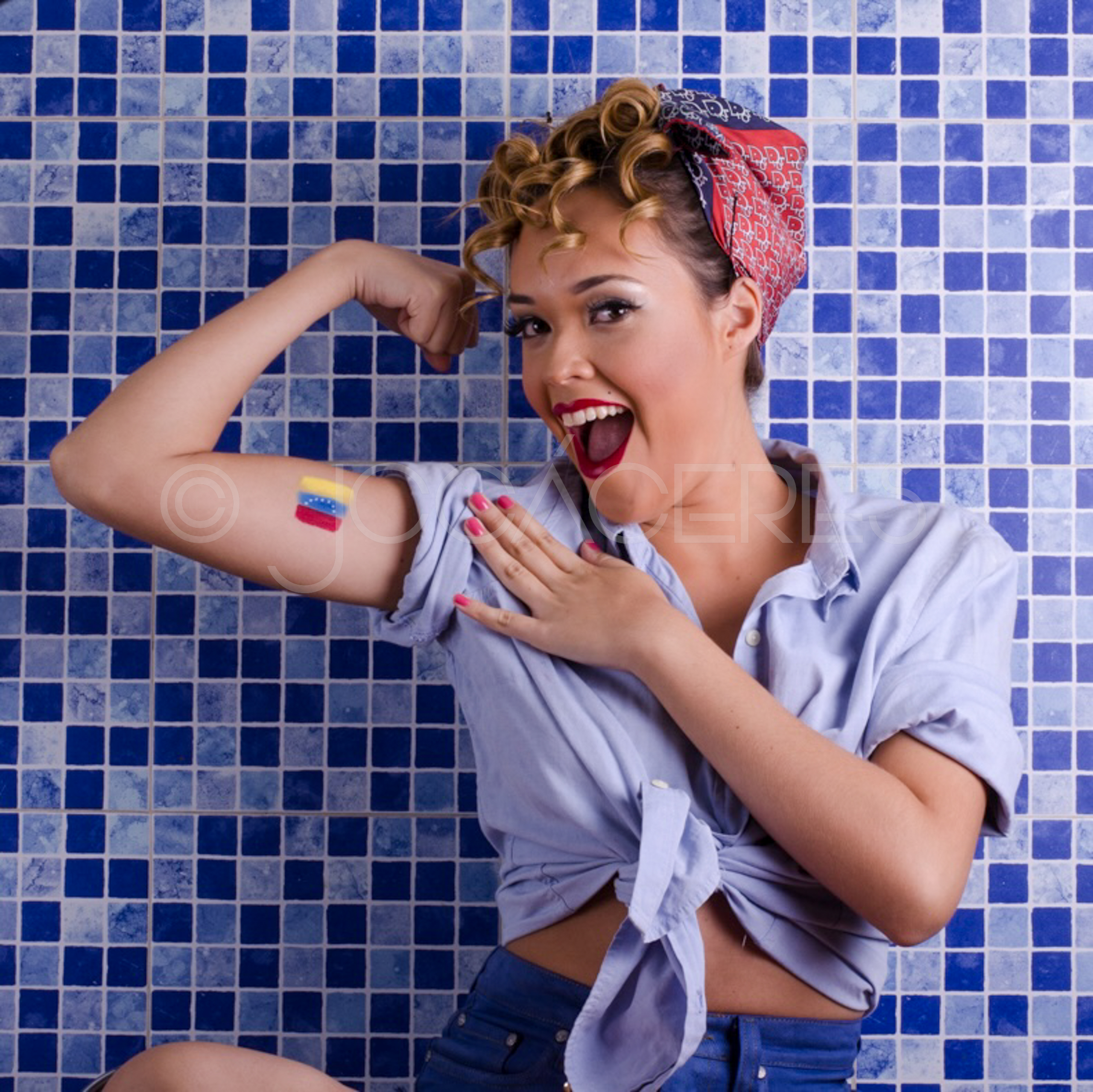Este retrato tiene un espíritu vibrante, reivindicativo y alegre, con claras referencias al icono Rosie the Riveter, pero reinterpretado con energía latina y una identidad contemporánea. El gesto de fuerza, la sonrisa y la bandera crean un retrato de orgullo y empoderamiento lleno de color y actitud.