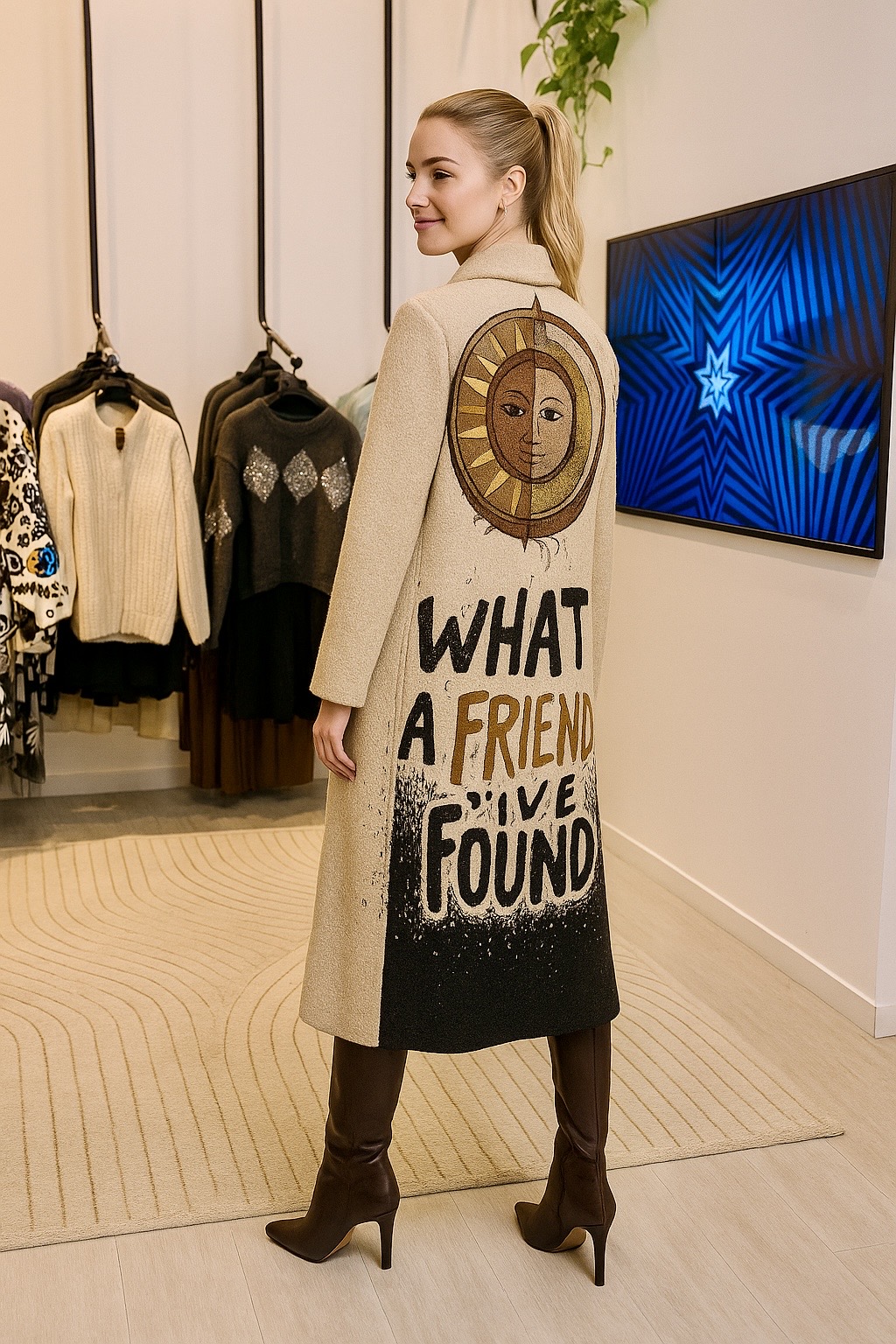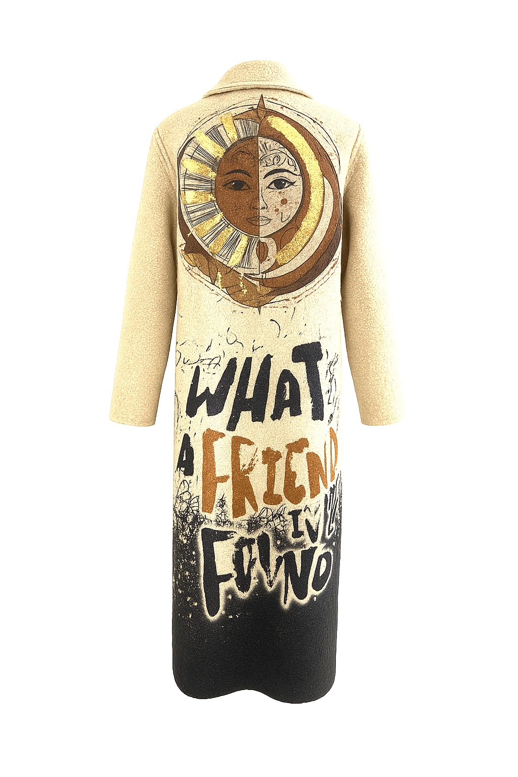 Este abrigo largo con tejido buoclé combina elegancia, calidez y simbolismo. Su textura suave y envolvente transmite confort inmediato, mientras que su corte estructurado con solapas amplias y dos botones frontales aporta una silueta sofisticada y atemporal. posee dos bolsillos externos frontales. La parte posterior es una verdadera obra de arte, con un estampado exclusivo con el sol y la luna en tonos dorados, representado la dualidad entre la luz y la sombra, el día y la noche, el alma y la materia. Debajo la frase refuerza el mensaje de conexión, gratitud y equilibrio interior. Ideal para mujeres y hombres seguros, con un espíritu libre y una mirada artística del mundo. Perfectos para días fríos donde deseas destacar sin esfuerzo: sobre un look de noche o vaqueros y botas al mejor estilo urbano chic.