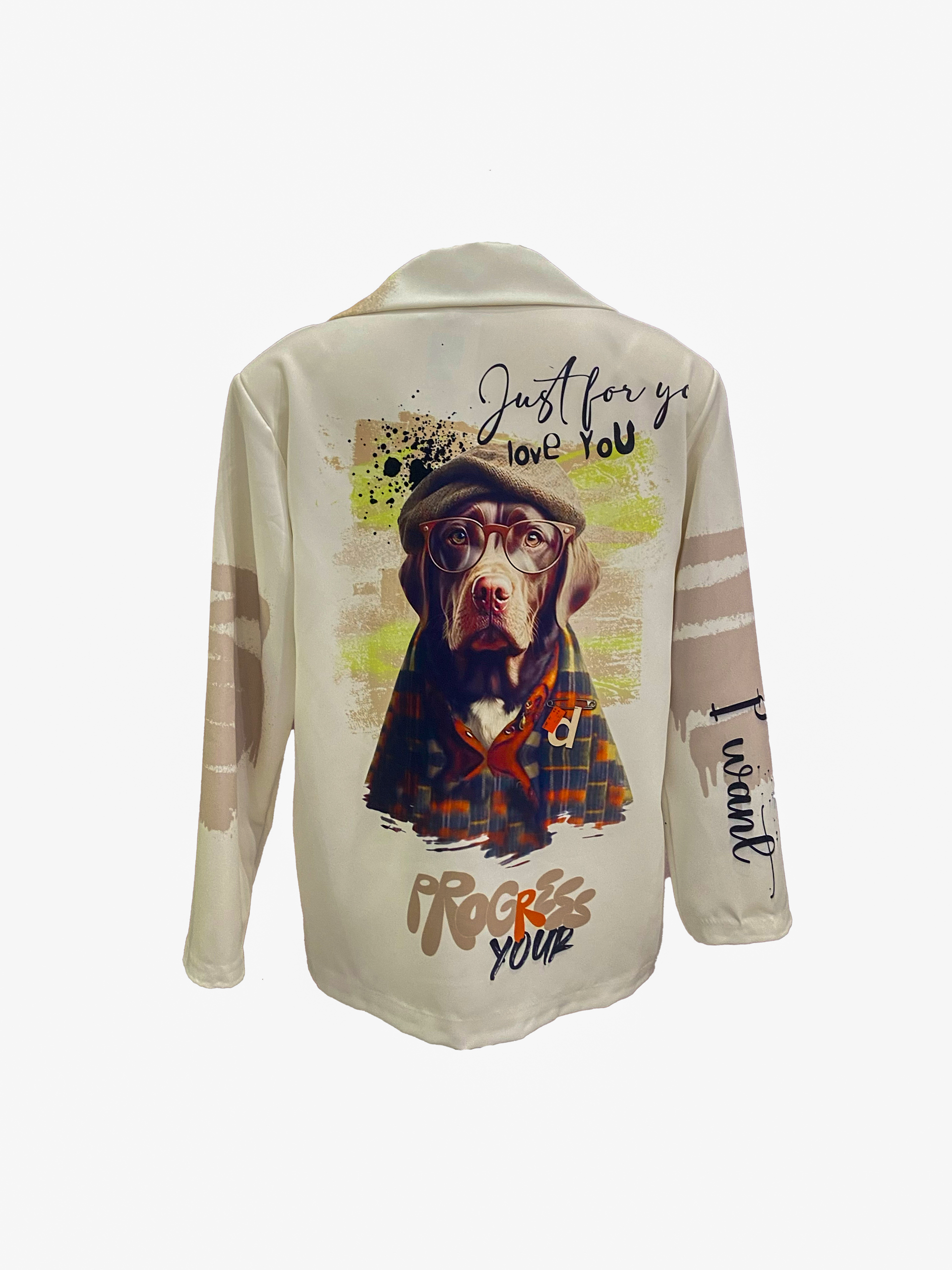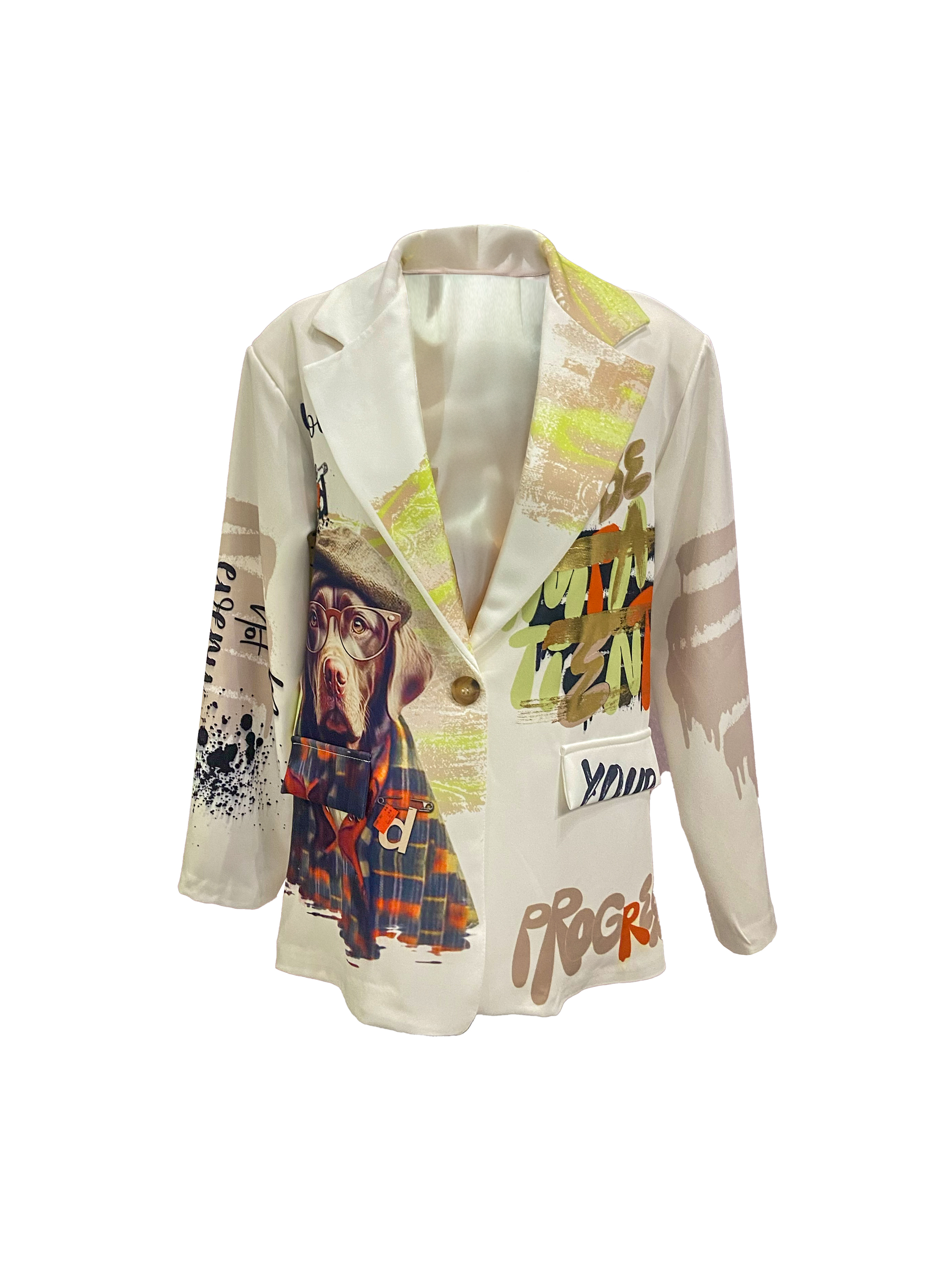 Creativa americana/blazer de un botón, con diseño artístico urbano que combina ilustraciones, tipografía y toques de color. Destaca por su estampado frontal y posterior que dan una estética de arte callejero contemporáneo. Posee dos tapas de bolsillos falsos en la parte frontal y forro en su interior a juego. Es ideal para eventos creativos artísticos, salidas casual chic, street style con intención y para hacer networking creativo o de moda. Al usarla te sentirás seguro y creativo, magnética y disruptiva , aire disruptivo y autentico y conectada (o) con el arte urbano, mezclando lo elegante de sastrería con la irreverencia del grafiti.