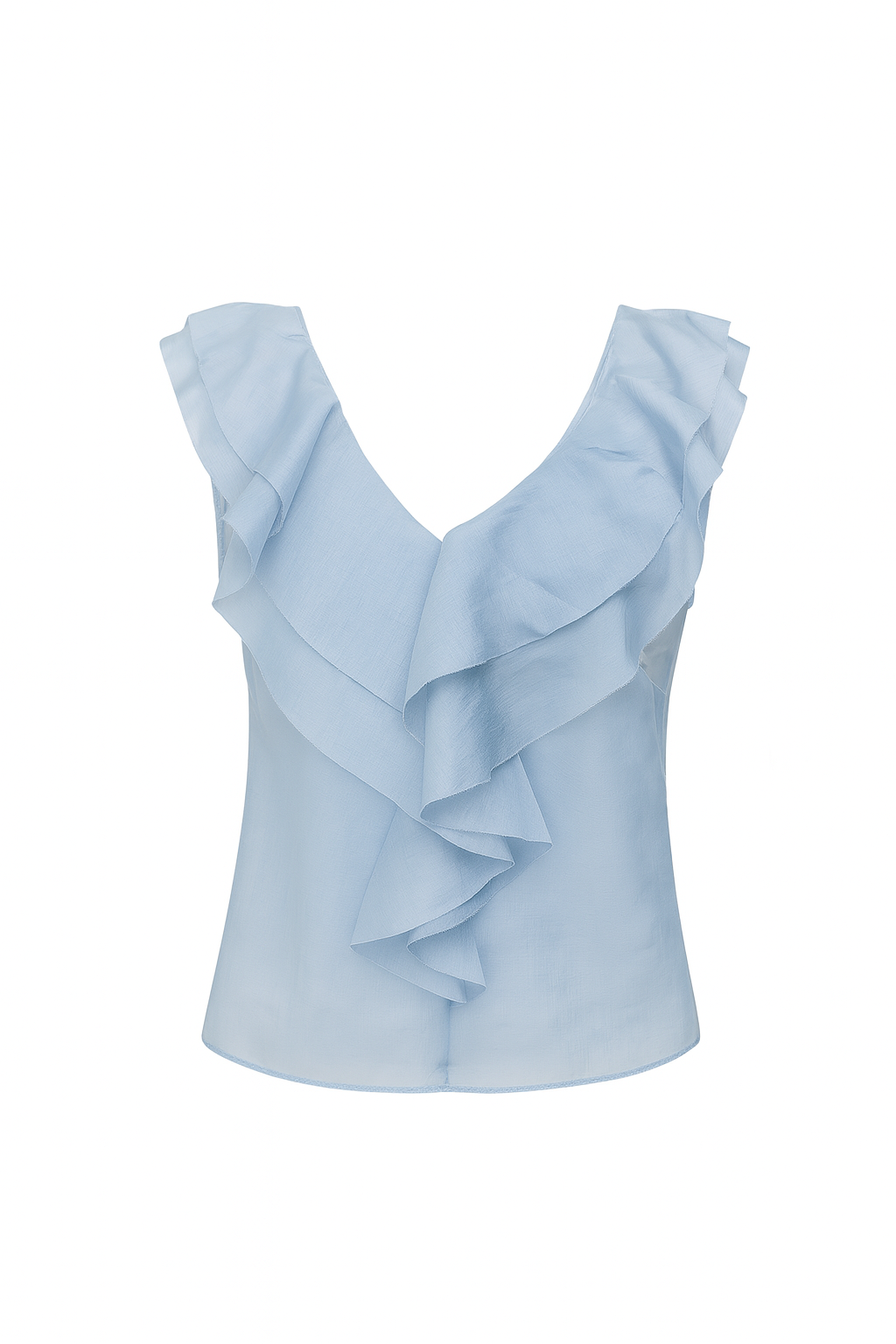 Fluida y traslúcida blusa con cuello en «V», para estilizar el cuello y alargar visualmente el torso. Adornado con volantes dobles que caen desde los hombros hasta el centro del escote, continuando en una linea vertical central, siendo los protagonistas de la pieza y aportando volumen y movimiento. Es ideal para eventos de día citas y salidas casual chic y para celebraciones al aire libre porque te hará sentir fresca y ligera, aportando femineidad y elegancia.