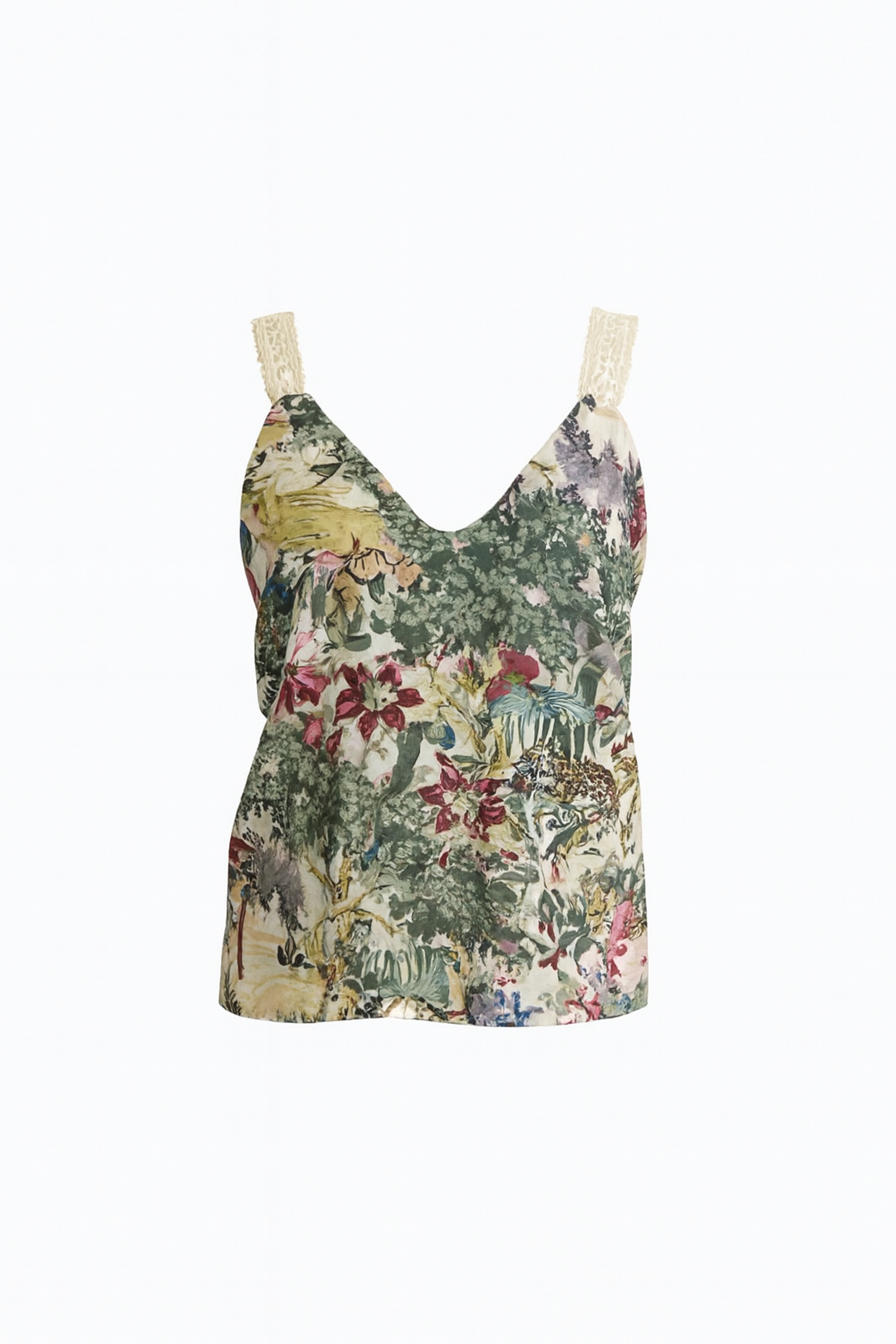 Fluida blusa de tirantes de encajes, estampado botánico y escote en «V» realzan el cuello y aportan frescura y femineidad. El tejido ofrece una caída natural que se adapta al movimiento del cuerpo, ideal para tardes cálidas o para llevar bajo una chaqueta ligera. Posee elástico en el escote trasero para adaptarse a cualquier talla. Te hará sentir libre, natural y en armonía contigo misma.