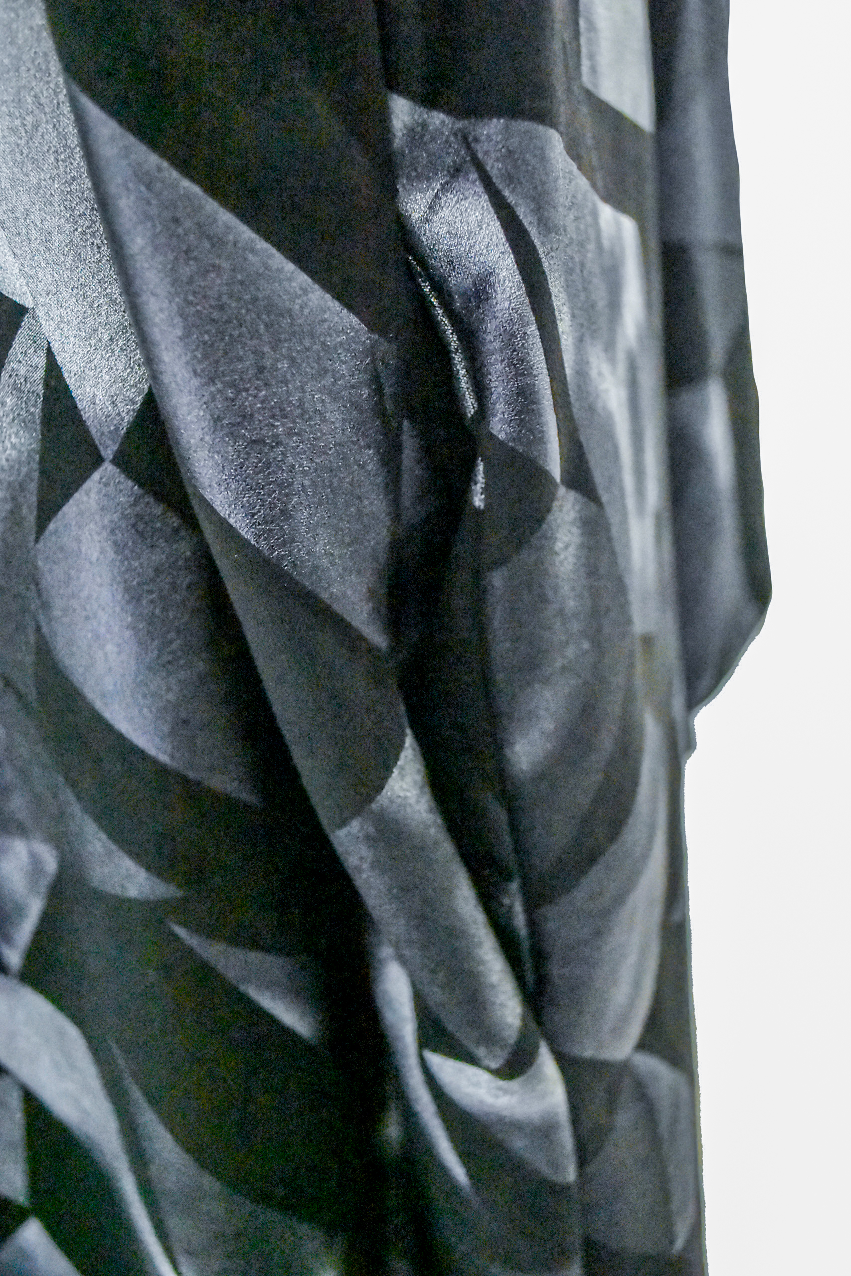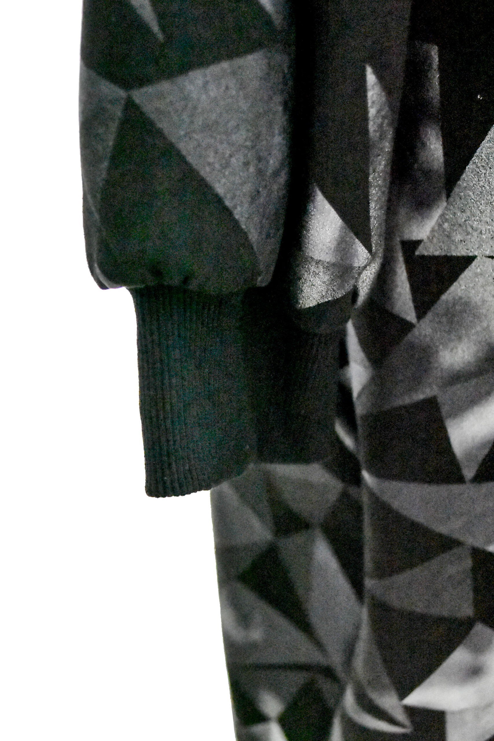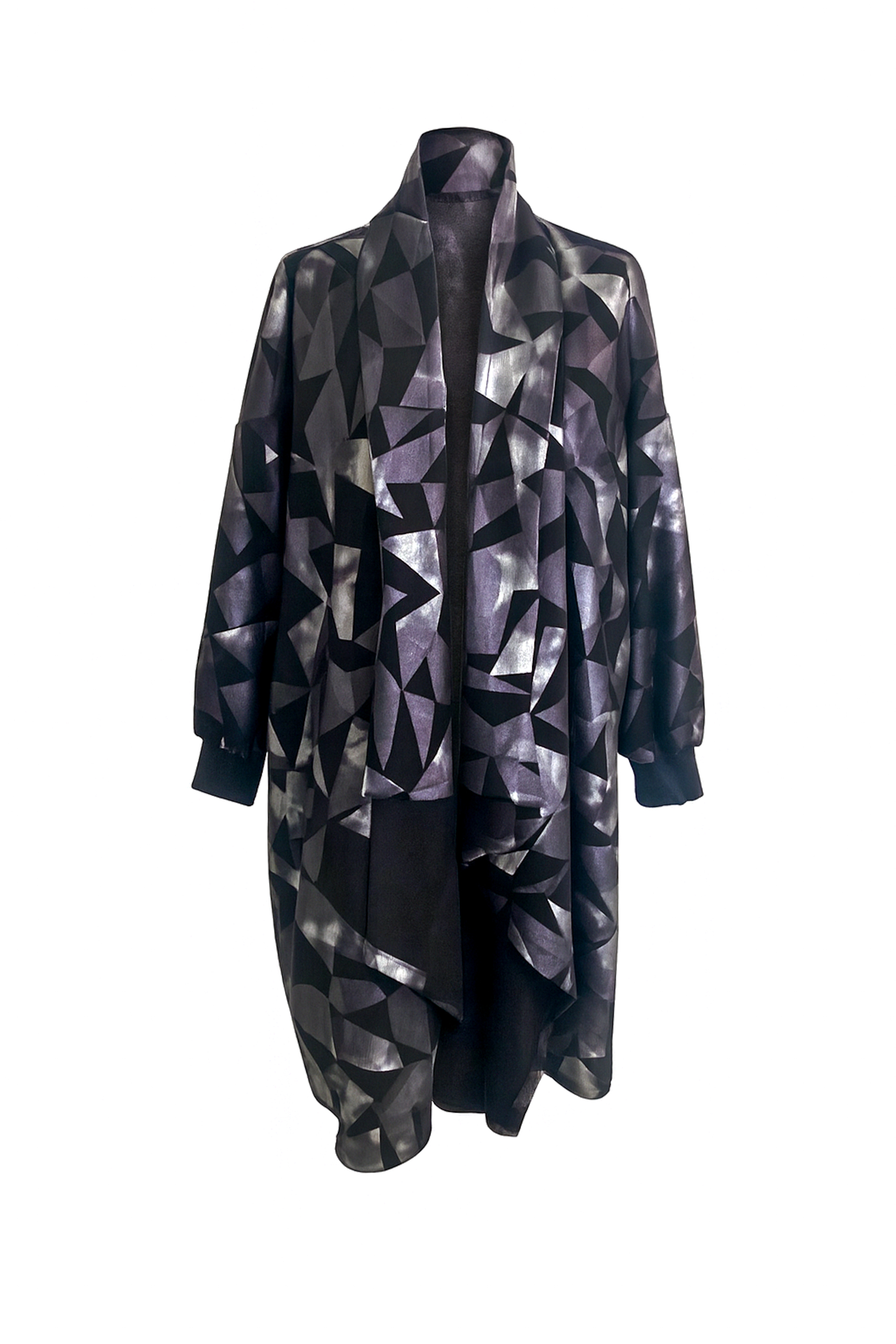 Es una prenda de carácter vanguardista que combina arte y elegancia. Su tejido fluido de textura satinada presenta un patrón geométrico en tonos metálicos que recuerda las sombras y reflejos de la luna sobre superficies oscuras. De corte amplio y caída asimétrica, esta pieza envuelve el cuerpo con ligereza y movimiento. Posee bolsillos y sus mangas tipo bomber cambian la lectura de la prenda y  da ese aire contemporáneo y urbano que la distingue. Ideal para cualquier ocasión diurna o nocturna, con vaquero o traje de noche te hará fluir con seguridad y magnetismo.