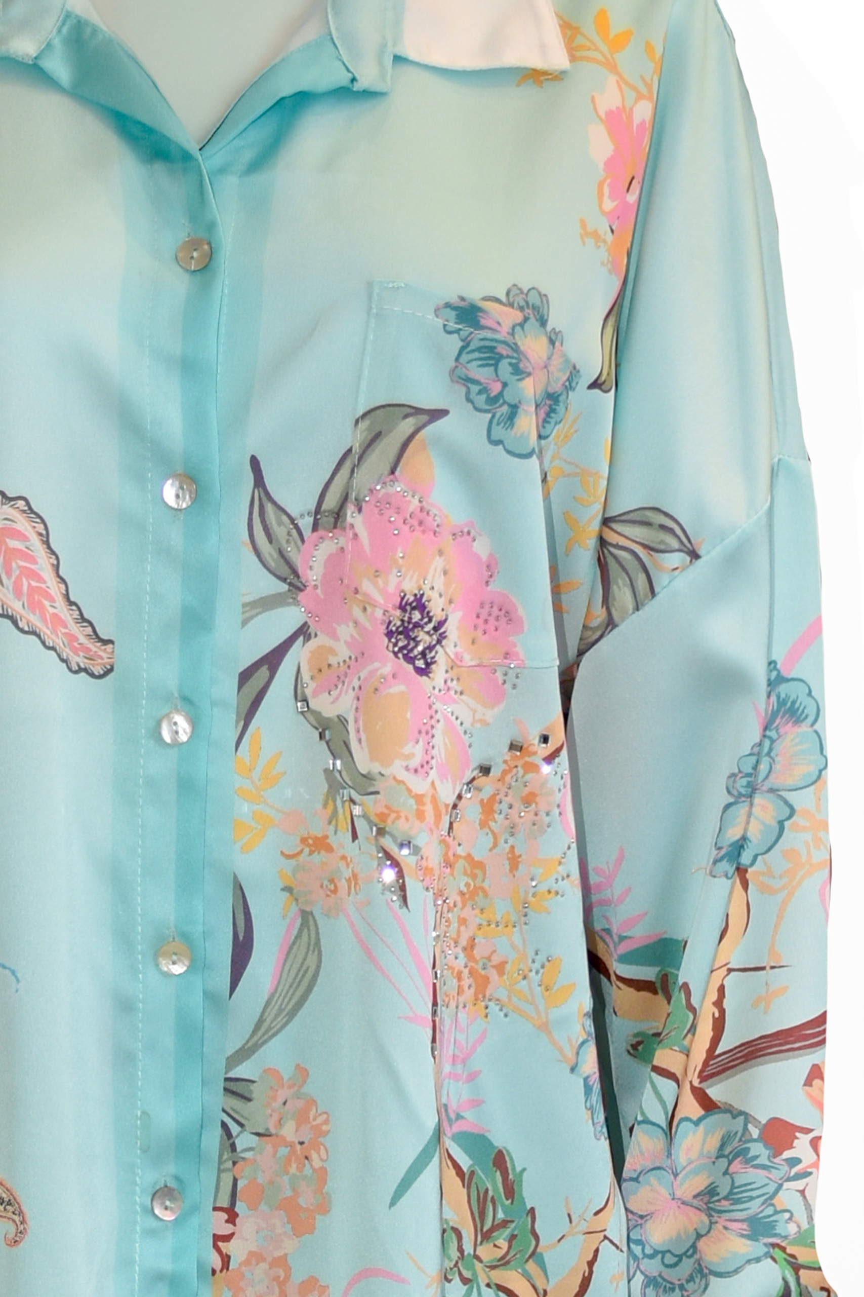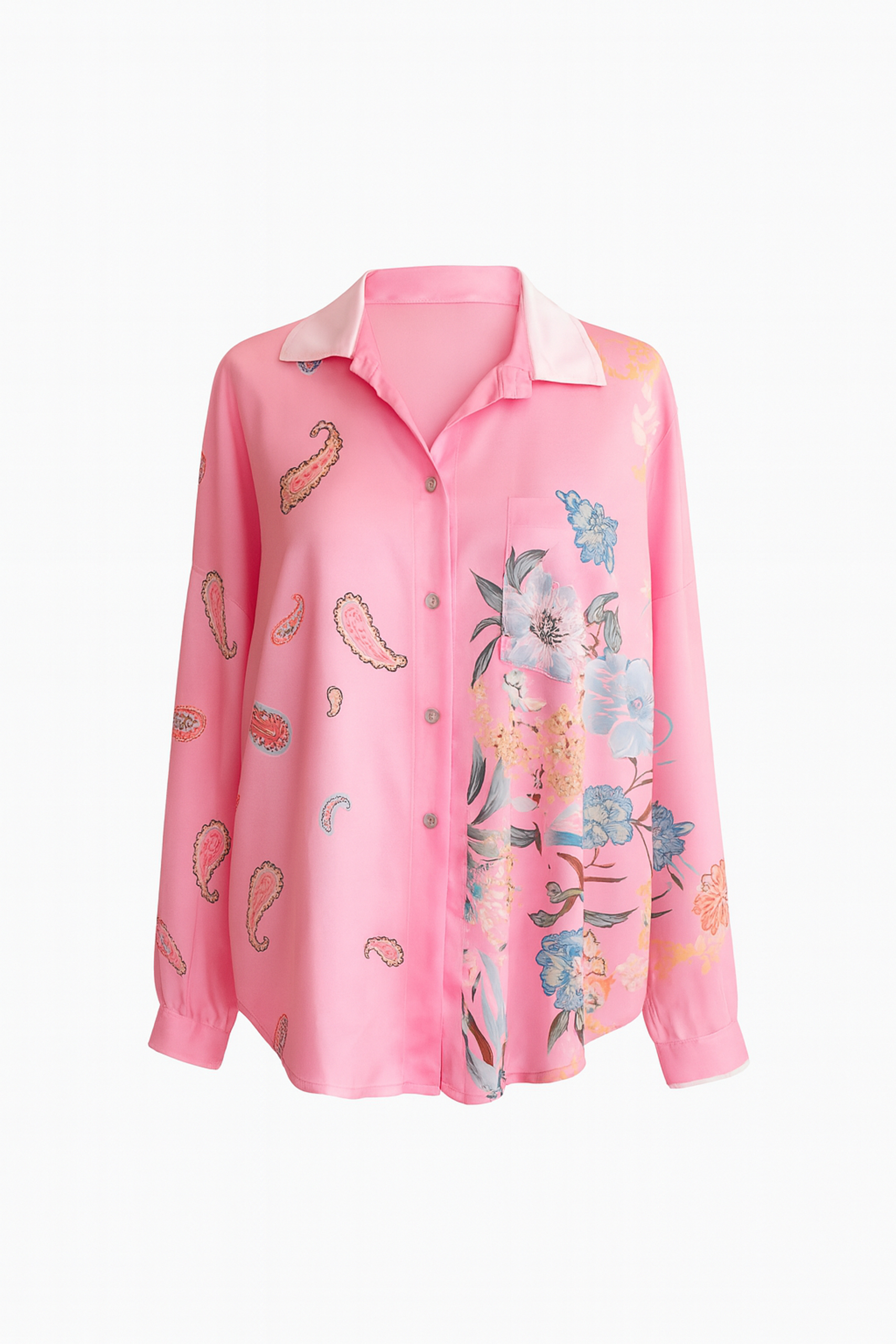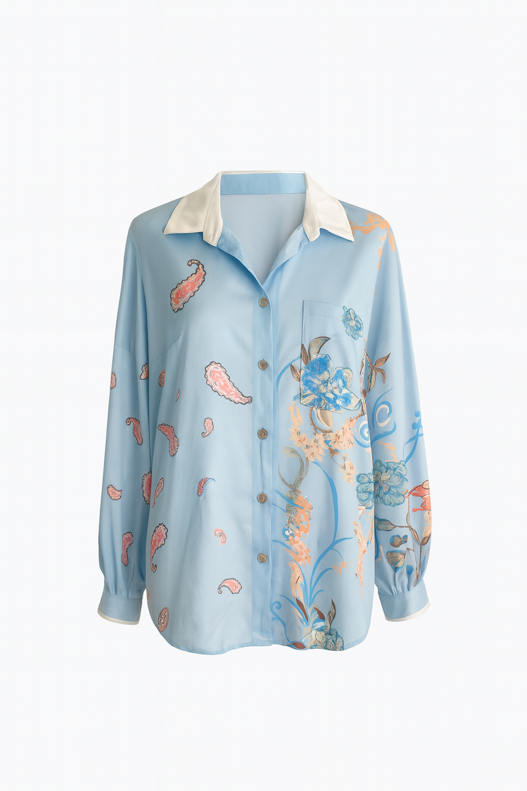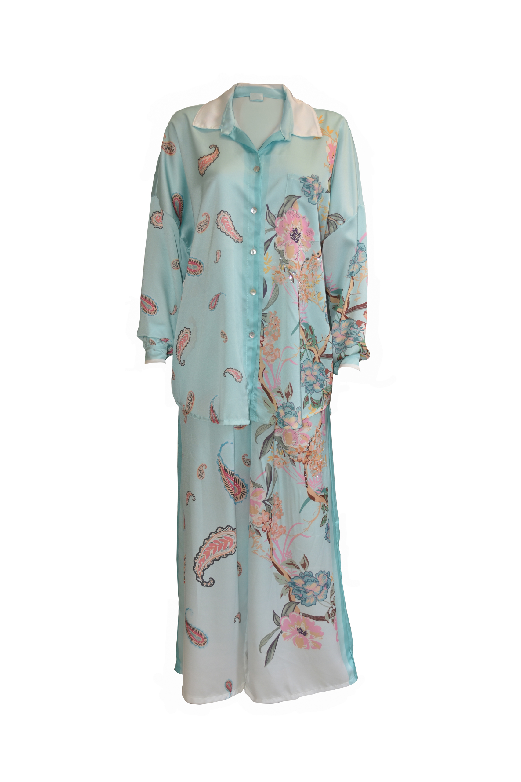Suave, etéreo, lleno de movimiento, este conjunto transmite la elegancia relajada de un verano infinito. Combina un camisa mangas largas fluida con un bolsillo y botones, con pantalones amplios de pretina elástica, caída libre y bolsillos laterales. El estampado en tonos pasteles y sutil pedrería añade un toque artístico y femenino que evoca un jardín flotando. El diseño ofrece una sensación  frescura y libertad: la tela acaricia la piel con suavidad, mientras que el corte te invita a moverte con ligereza y confianza. Ideal para días luminosos, eventos al aire libre y noches de verano donde la elegancia se viste de serenidad.
