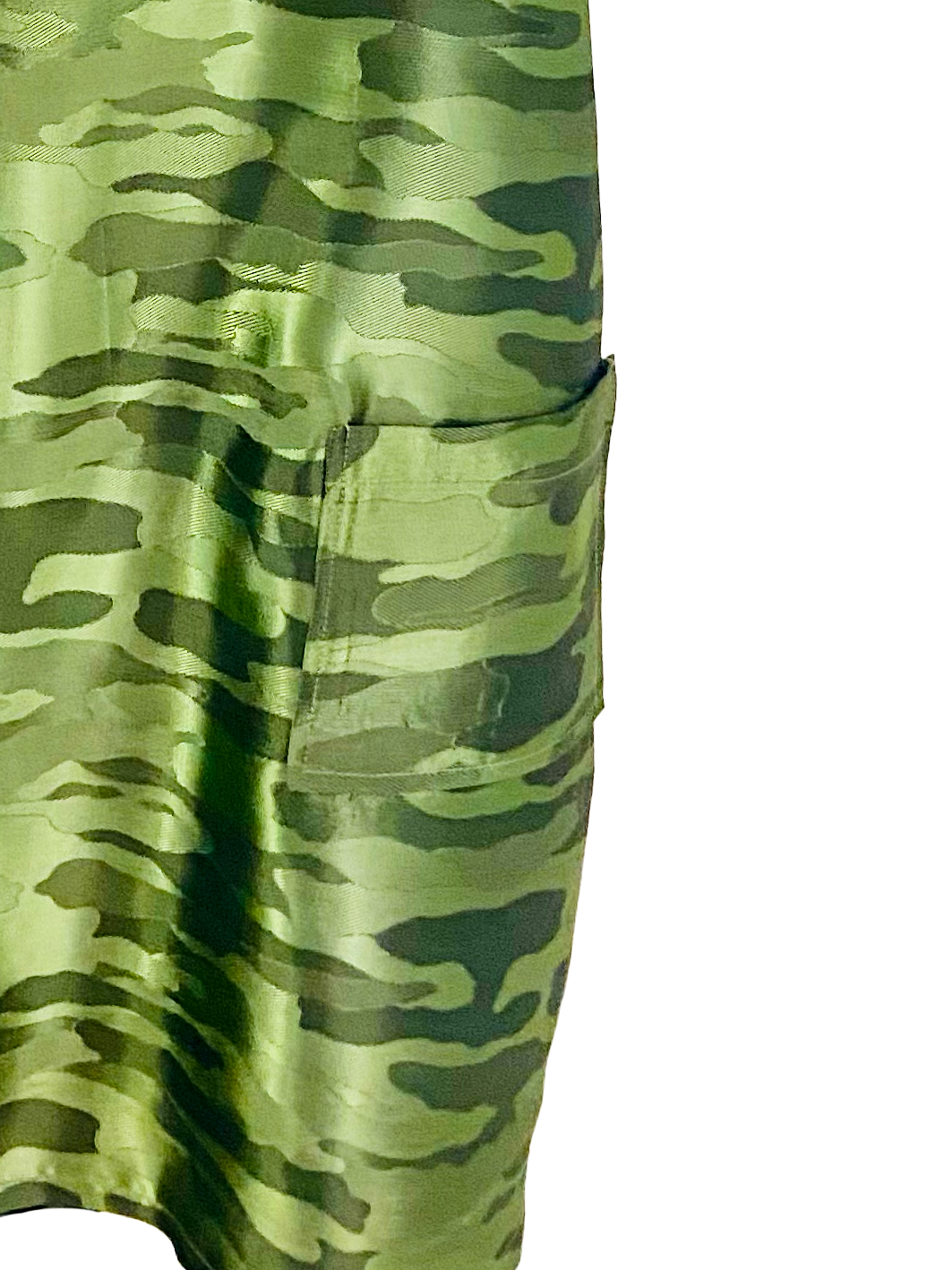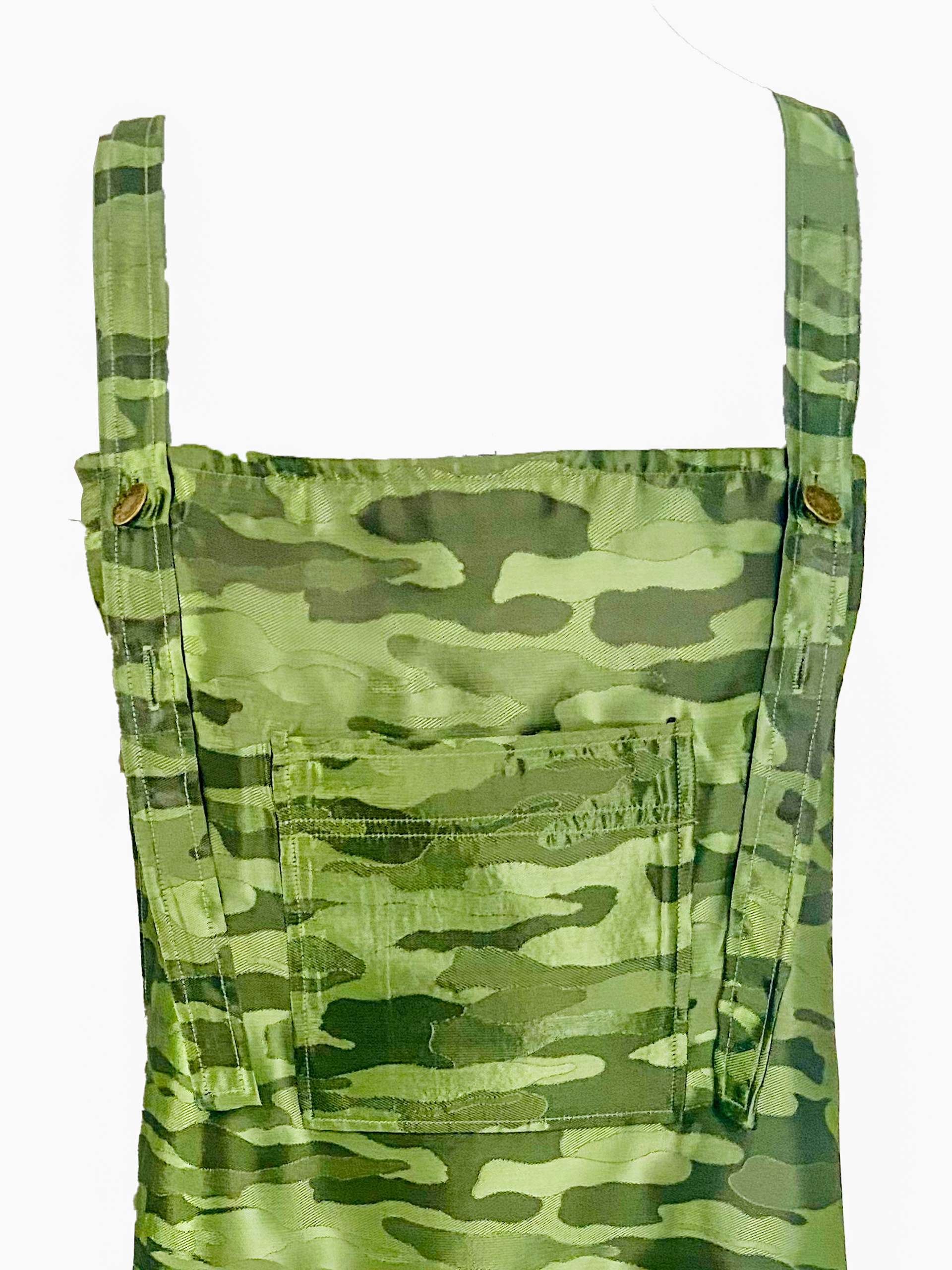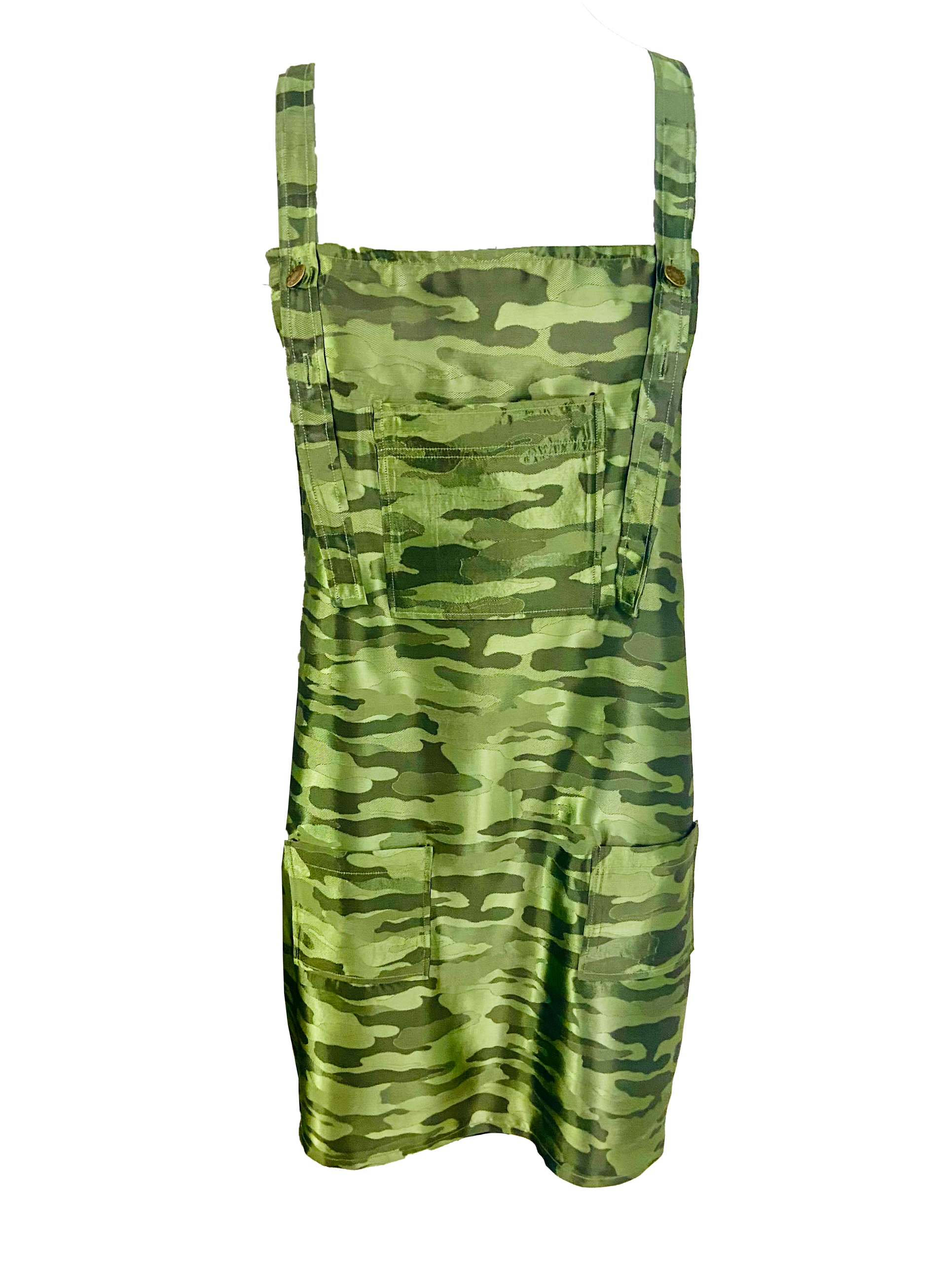 Relajado y utilitario jumper o peto de falda mini, con estampado de camuflaje camisero sin mangas y estampado de camuflaje ideal para salidas con amigos en eventos casuales, estilo safari chic o casual de oficina creativa y sin lugar a dudas para viajar y festivales al aire libre. Posee tirantes con ajuste mediante botón en la parte superior. Dos bolsillos delanteros grandes en la parte baja , reforzando el aire practico y casual que te hará sentir, al igual que un toque juvenil y desenfadado lista para moverte, pero con un toque atrevido.