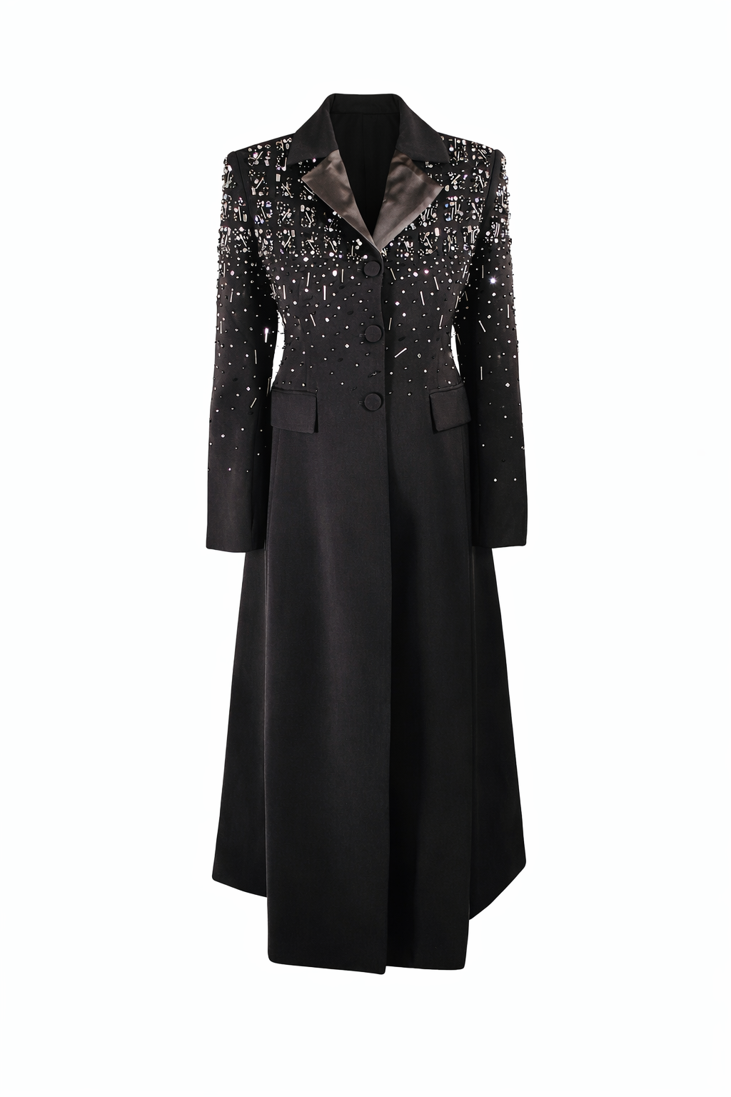 Sobrio y elegante abrigo largo de silueta estructurada. El cuerpo se presenta limpio , mientras que la parte superior se ilumina con una constelación de aplicaciones brillantes, creando un contraste entre oscuridad y luz que recuerda a un cielo nocturno en movimiento. El cuello sastre en satén aporta un gesto clásico reinterpretando la alta costura, acompañado de botonadura frontal forrada y bolsillos discretos que mantienen la pureza del diseño. Te aportará una sensación imponente, elegante y seguridad al usarlo. Ideal para eventos nocturnos, alfombra roja, galas, editoriales de moda y eventos nocturnos familiares muy importantes.